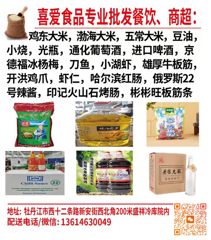 喜爱食品专业批发饭店/超市:鸡东大米,渤海大米,五常大米,镜泊之乡大豆油,圣水泉小烧,通化葡萄酒,特价啤酒,冰杨梅,湖虾,王牌虾,虾仁,俄罗斯辣酱,联系电话/微信:13614630049